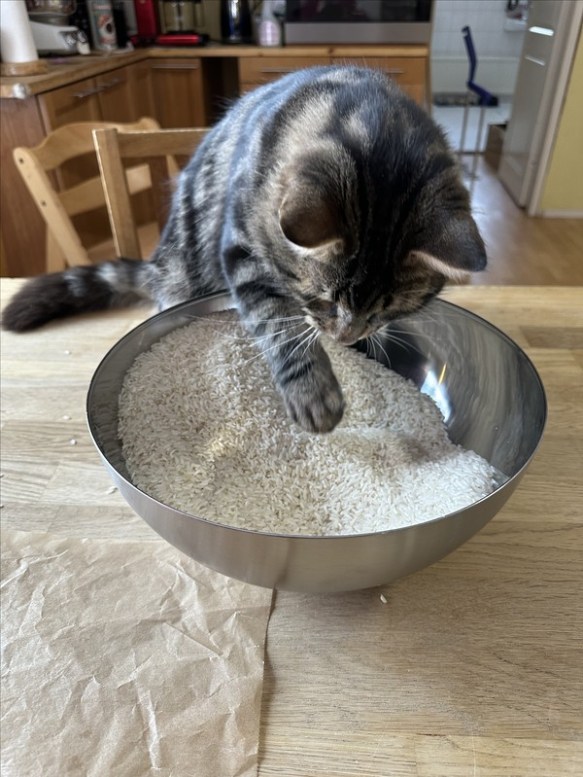 6 Husdjur. Saffran, renrasig dvärgvädur som fyller 3 i augusti. Flisan som vi adopterade för ett år sedan, blir också 3 i år, en blandning mellan rex och lejonman. De huserar i mitt kontor och äter tapeten till mellanmål. Sixten, en 8 månaders bodkatt på nästan 6 kg.