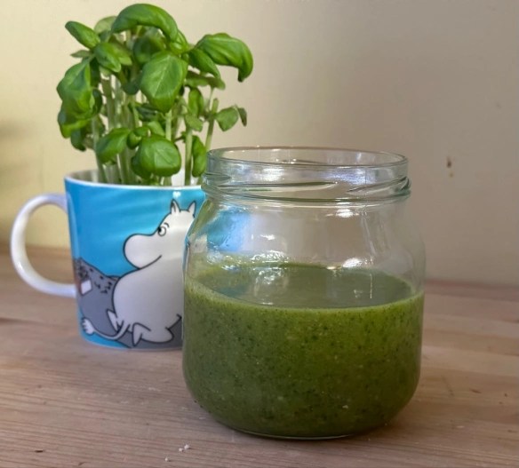 Klipp av bladen från basilikan och mixa dem tillsammans med de övriga ingredienserna till en slät massa i en skål