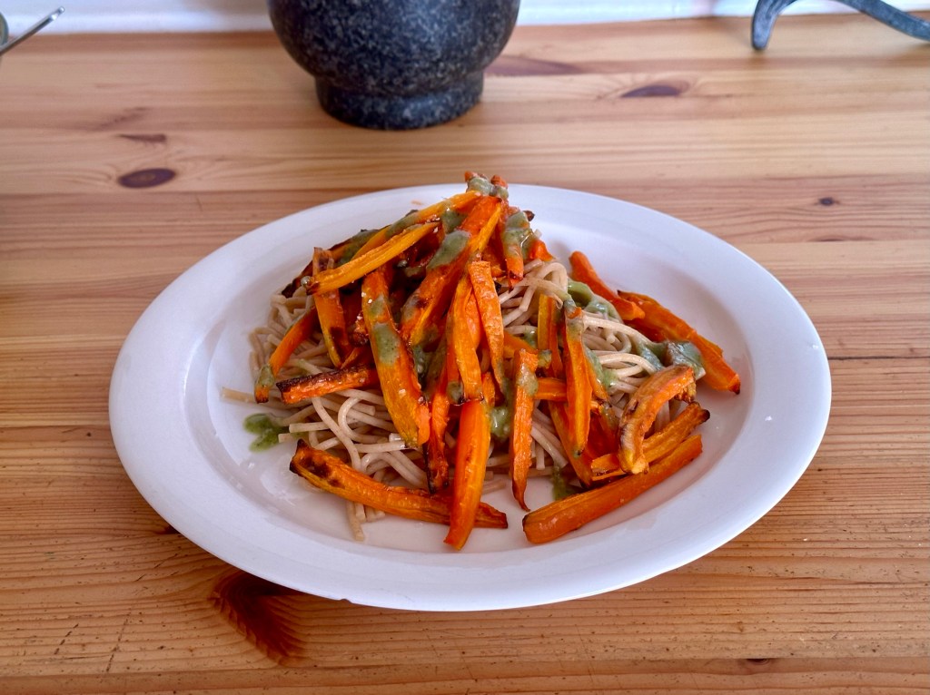 Serva pastan med morötterna och ringla över peston. Strö över lite flingsalt enligt smak.