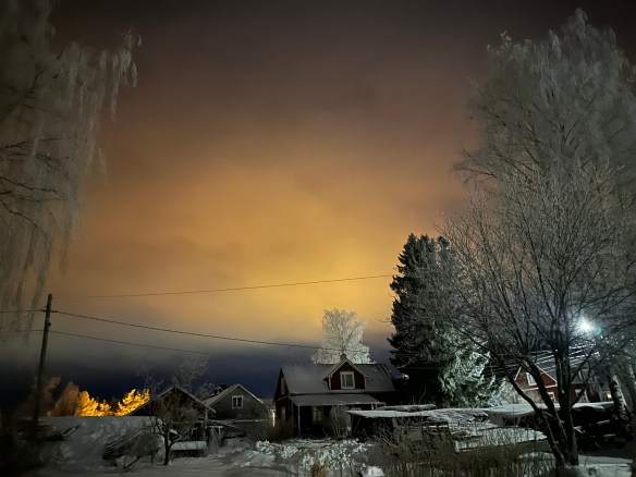Fångade en magisk bild här en morgon. Bilden är tagen i öst så är inte solen som gör det, den stiger inte ens upp före om två timmar. Ljuset på träden är en bil på tomgång så är inte heller det som färgar molnen. Finns bara skog och åkrar så inte heller ljusföroreningar. Vad tror ni skapar ljuset?